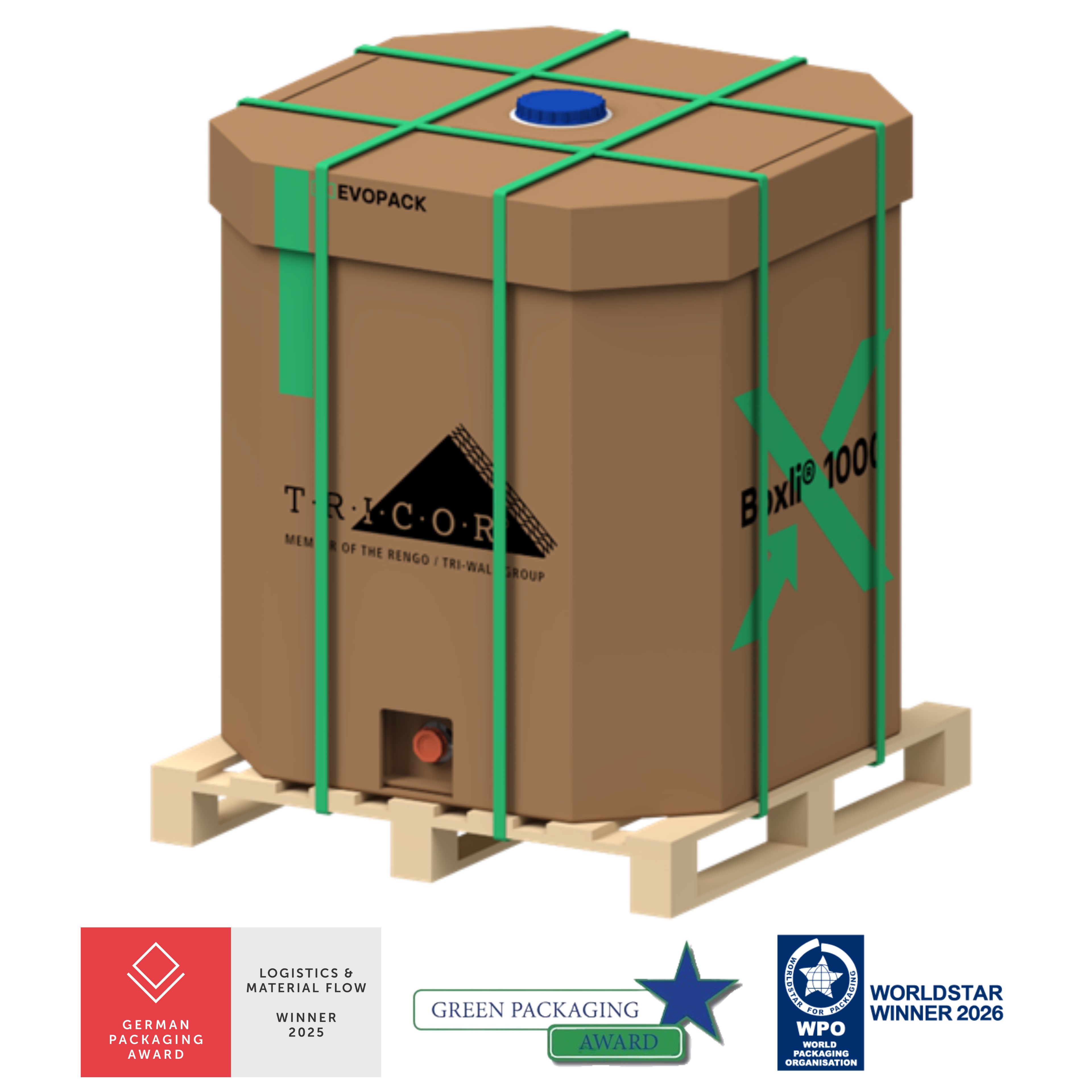 The first 1000 Liter bag-in-box packaging for water-based non-dangerous liquids and technical chemistry.